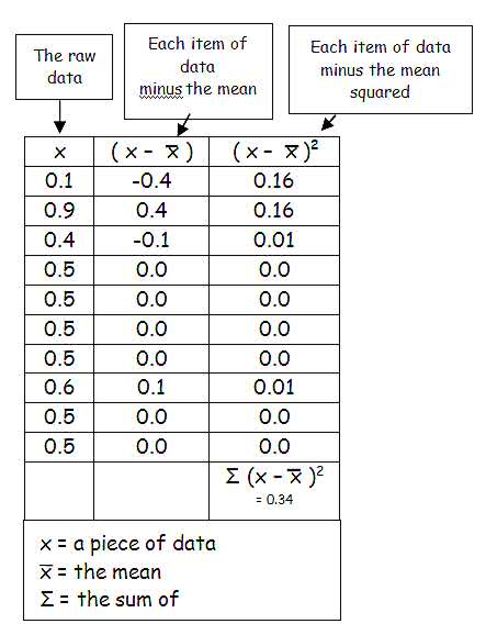 The first column (from the left) is each piece of raw data. The second column from the left is the distance of each piece of raw data from the mean. Note that if we just added this column up the values would cancel each other out and we end up with a value of zero. Obviously this is no use as a measure of scatter of the data about the mean. The way around this problem is to square each of the values from the second column. The negative values now become positive values and we can add them up. This has been done at the bottom of the third column (= 0.34). |