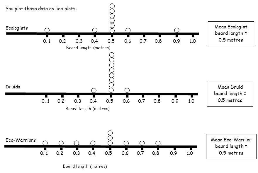 Notice that the mean beard length of all groups is the same (0.5m). The data for each group are however obviously different in the way that individual data points are scattered about the mean. Nearly all Ecologists have beards of 0.5m (the mean value) but there are a couple of illegally short beards and two bigger growths (one you will note is of such massive proportions that it could conceal a veritable menagerie of nesting creatures). Druids are very consistent in their beard lengths. Eight out of ten measured growths are of 0.5m. There is just one shorter beard (probably a trainee) and one slightly bigger version belonging to a non-conformist druid. The Eco-Warrior’s beard lengths are much more spread out around the mean, reflecting an inconsistant approach to bristle growth and (in 4 cases) blatent disregard for the constitution of the RSPB.